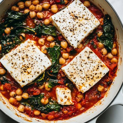 Once everything is baked and bubbling, carefully remove the dish from the oven. Now it’s time to stir in the drained and rinsed chickpeas along with two generous handfuls of fresh spinach. The heat from the dish will wilt the spinach perfectly without overcooking it.