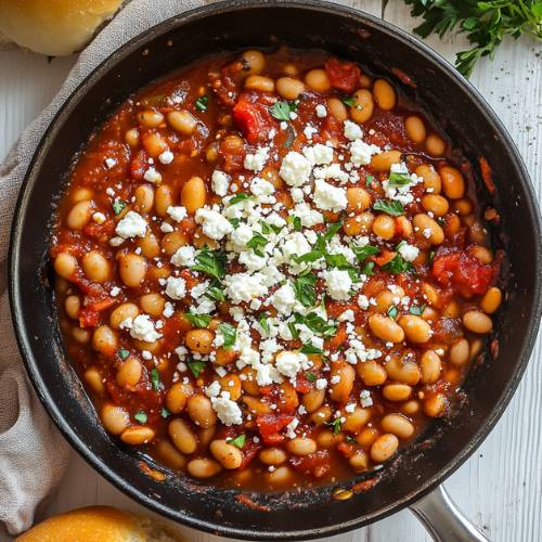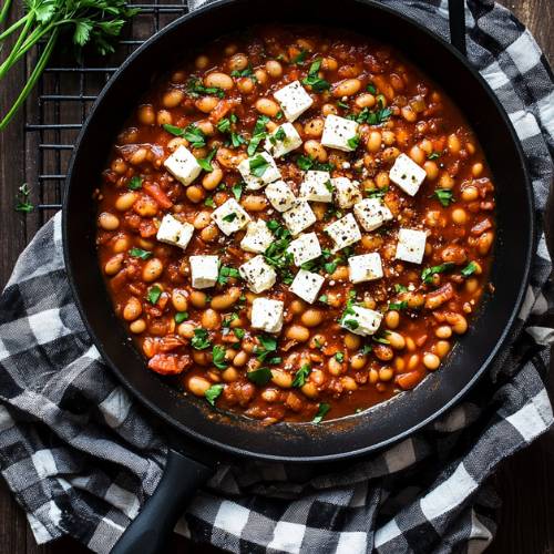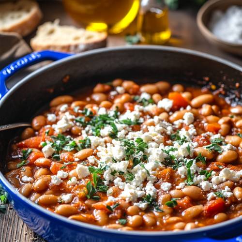 Once the casserole is ready, spoon it into bowls or serving dishes. Now comes the best part: crumble the feta cheese right on top of the hot bean mixture. The heat will soften the feta just a little, making it creamy and extra tasty. Finish it all off with a drizzle of olive oil and a sprinkle of chopped parsley for a fresh, herby kick.