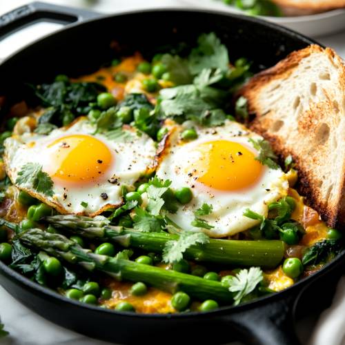 If you’ve never had shakshuka before, it’s usually made with eggs and tomatoes, but this version is packed with green veggies like asparagus, peas, and leeks. It’s healthy, colorful, and all made in one pan perfect for breakfast, brunch, or even lunch!