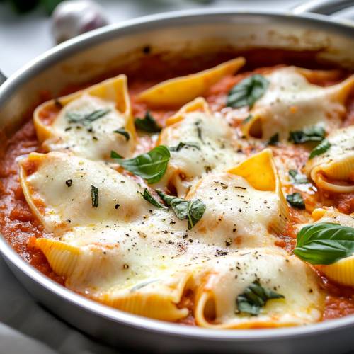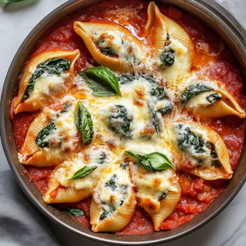 Now assemble the final dish. Place the stuffed shells carefully on top of the marinara sauce in your oven-safe pan or dish. Try to arrange them in a single layer so they cook evenly. Once all the shells are nestled into the sauce, pop the pan into a preheated oven at 375°F (190°C). Bake for about 20 minutes, or until the cheese is bubbling and the shells are soft. Keep an eye on them near the end so they don’t overcook.